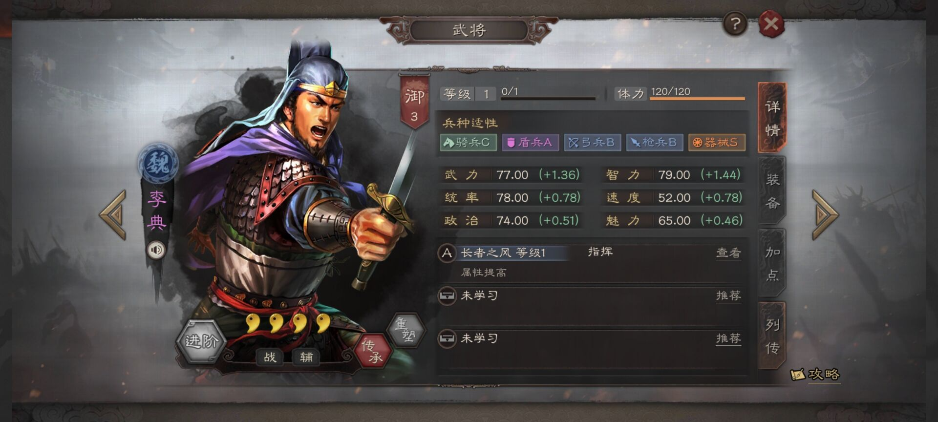 李典作为前期开荒的神将,他的核心战法长者之风绝对是咱们前期过渡的宝藏技能。这个战法能让全队武力、智力双双提升,在武将属性普遍偏低的开荒阶段,这种增益效果特别实用。如果搭配双修型武将,比如那些既能打物理又能玩法术的,收益会更高。建议优先把李典的长者之风升满级,这样增益效果会更明显。