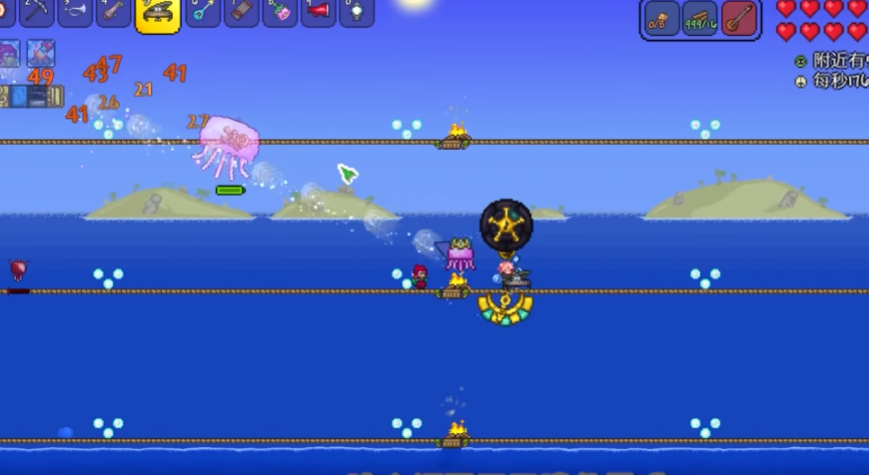 除了钓鱼,粉水母也会以敌怪的形式出现在海洋或地下水域。它们会主动攻击靠近的玩家,伤害不算高,但要注意它们在专家模式会放电,碰到带电的水母会受到额外伤害。击败粉水母敌怪有小概率掉落水母项链,这个饰品能在水下发光,对于探索海洋或地下湖泊很有帮助。