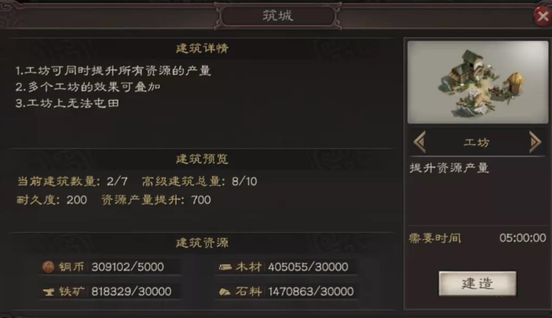 当你拥有了七级地,接下来就是建造工坊的环节。建造工坊需要满足两个关键条件,一是你的名声值,二是资源。你的名声值需要达到6000点,才能解锁第一个工坊的建造权限。你的名声值每增加2000点,就可以多建造一个工坊。所以前期努力做任务、打地提升势力值来增加名声非常重要。除了名声,建造和升级工坊需要消耗大量的资源,主要是木材、铁矿和石料。在准备建造前,确保你的资源储备是充足的,最好提前有意识地囤积一些。在城建界面选择占领的七级地,就能找到建造工坊的选项了,点击建造,等上一段时间,你的第一个工坊就立起来了。