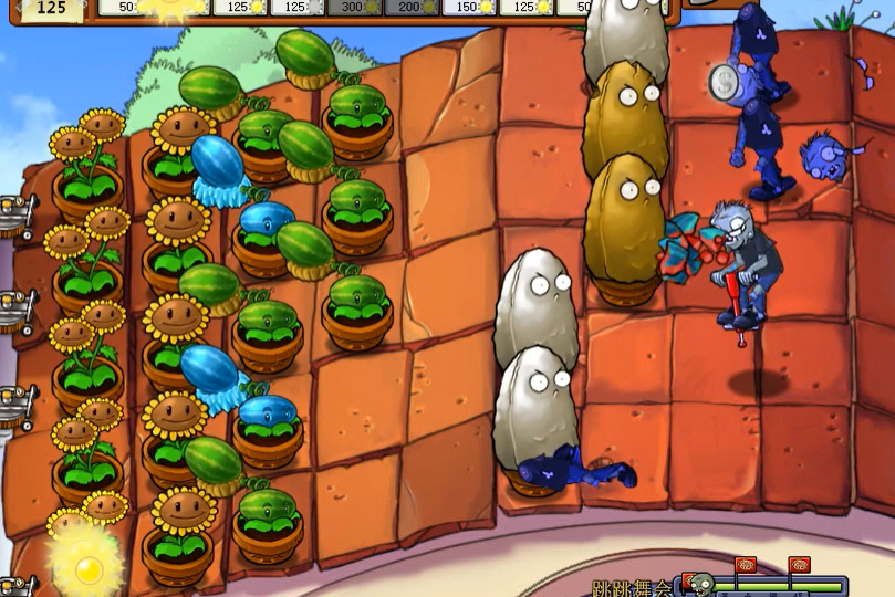 后期的关键在于巩固和完善防线,僵尸波次增强,需要将前排的向日葵逐步替换为双子向日葵来提升阳光产能,并持续补充被破坏的高坚果,同时在后排填满西瓜投手以形成密集的火力网,注意僵尸会伴随音乐节奏跳跃前进,因此要保证每一行的防御均衡,当出现大量僵尸聚集的紧急情况时,果断使用预留的樱桃炸弹或火爆辣椒进行清场。