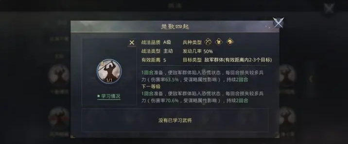 张奂作为四星武将,在前期开荒和特定阵容中具有实用价值。其自带战法威震北疆能对敌军群体施加恐慌状态并降低谋略属性,配合谋略型输出战法可形成有效压制。该武将通常作为辅助或副输出位使用,尤其在汉阵营队伍中能发挥稳定作用。