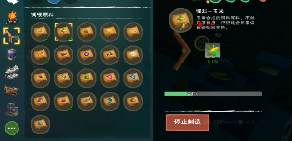 蓝马饲料的配方很简单,需要河豚、小麦饲料和玉米饲料这三种材料。河豚可以通过钓鱼获得,建议用小蚯蚓在河流区域垂钓,运气好的话很快就能钓到。小麦和玉米可以在平原或热带雨林采集,或者自己种植更省心。记得先把小麦和玉米在工作台做成饲料包,五份原材料合成一份饲料包,这样后续烹饪会更方便。