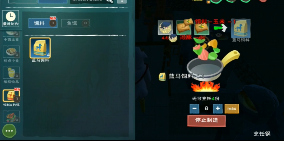 准备好材料后,咱们需要找个烹饪锅来合成饲料。把小麦饲料包、玉米饲料包和河豚一起放进锅里,点击开始烹饪就能得到蓝马饲料啦。注意别直接喂河豚,那样是没用的,必须做成饲料才能提升蓝马的好感度。一般来说,驯服一只蓝马需要准备7到10包饲料,具体数量可能会有点浮动,所以多备几包更稳妥。