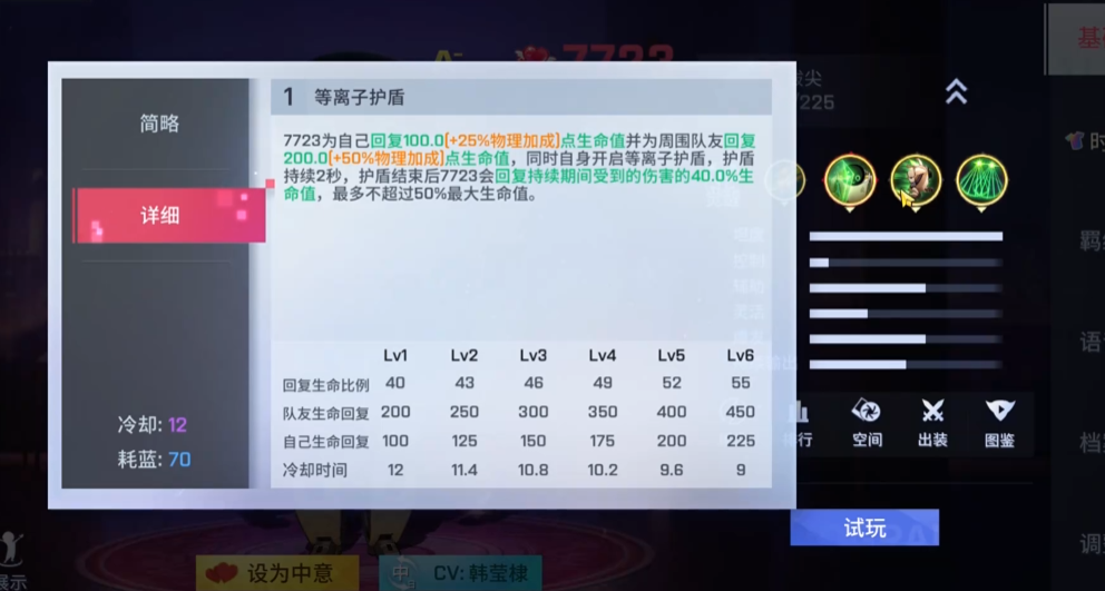 一技能是核心生存手段,可以为周围队友回复生命值并为自己开启护盾,护盾结束后还能回复期间受到伤害的部分血量。二技能是位移兼输出技能,向指定方向突进并强化下次普攻,造成高额物理伤害和减速效果。大招开启后能回复自身生命值并对敌人造成多段伤害,觉醒后还附带沉默效果。技能连招没有固定模式,通常用二技能近身接普攻,看情况开一技能或大招。