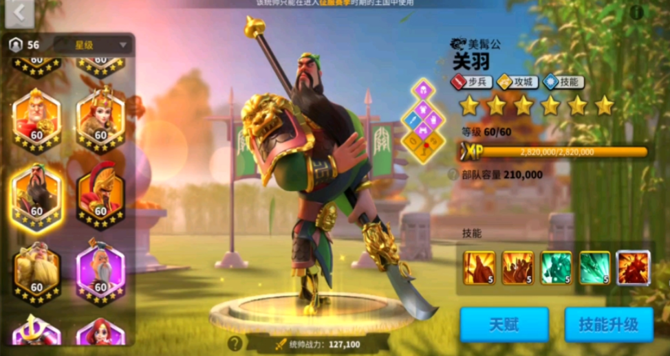 关羽的强度依赖于步兵兵种支撑与护盾类技能的联动。其技能机制决定了在大型团战与集结作战中表现突出,但单兵作战能力有限。培养时应优先觉醒一技能武圣与四技能青龙偃月,确保输出与控制能力最大化。后期可通过联盟科技与VIP等级进一步提升带兵数量,弥补步兵机动性不足的缺陷。