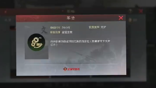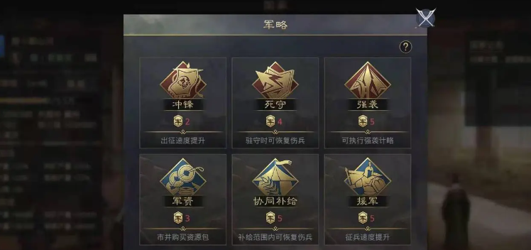 除了军资外,军略还包括其他种类,比如冲锋可以提升全盟的出征速度,死守在驻守时恢复伤兵,强袭用于执行特殊计略,协同补给在补给范围内恢复伤兵,援军则能增加征兵速度,每个类型都有独特的触发条件和效果范围。官员们需要根据战场形势选择最优的军略,比如在大规模进攻时使用冲锋来加快行军,或在防守时打开死守减少兵力损失。文武官员的军略各有侧重,武官发布后会刷新军略陈情让成员参与并获取功勋奖励,而文官更多是提供战略层面的支持,这需要同盟内部有良好的沟通和协作。