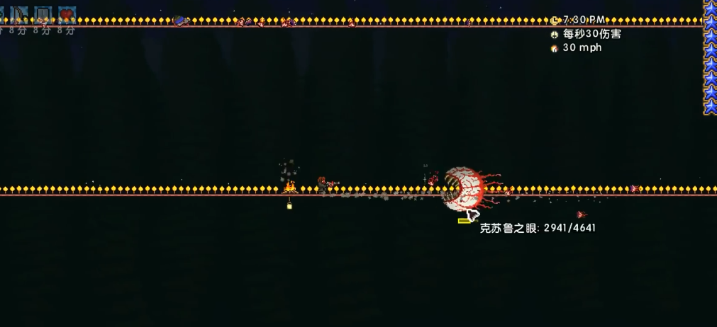 第一阶段战斗中,克苏鲁之眼会悬浮在玩家上方并召唤克苏鲁之仆小眼球,这些小眼球血量极低但会穿墙攻击。当boss生命值降至一半时进入第二阶段,瞳孔变为獠牙大嘴,防御降为0但移动速度和攻击频率大幅提升。专家模式下,第二阶段后期会进入狂暴状态,连续高速冲刺攻击玩家。建议在第一阶段优先清理小眼球,它们被击杀后会掉落红心恢复生命值。