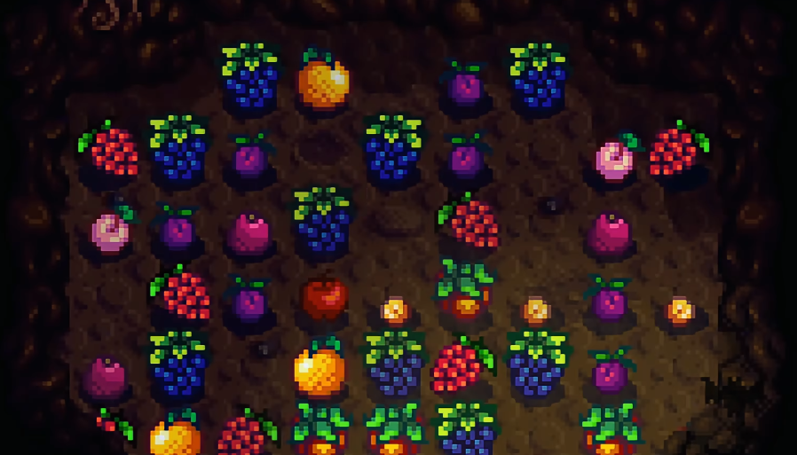 农场山洞位于地图北部区域,入口处有明显的岩石特征。触发事件后,山洞内部会生成六个固定容器用于存放产出物。若选择蘑菇模式,容器每天刷新不同类型的蘑菇,但未采集的蘑菇会在次日消失;选择果蝠模式则无固定刷新周期,但水果会持续累积且不会消失。蘑菇产出包含制作药水的关键材料,而果蝠产出的水果能解决早期果树幼苗昂贵的问题。
