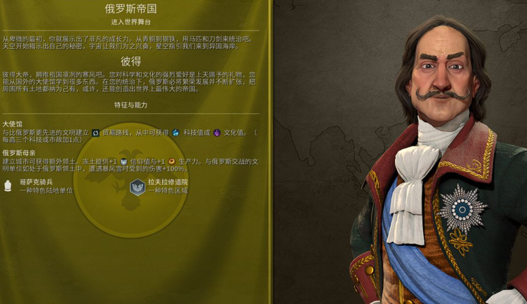 彼得大帝的特色能力主要体现在文化传播和宗教改革上,能够快速传播自己的文化并增强国家凝聚力,这种能力在需要扩大文化影响力和领土统一性的情况下非常有用,此外他还拥有强大的海军力量,这使他在面对海洋贸易和海外扩张时具有显著优势,非常适合千湖地图的岛屿环境。伊丽莎白一世的特色能力则主要体现在殖民和贸易上,这使她在发展经济和殖民扩张方面具有优势,她的海洋加成能让海军在分散的岛屿格局中发挥巨大作用。选择这两位领袖,需要注重发展港口和商业中心,特别是靠近河流入海口的城市位置以最大化相邻加成,并且必须尽早准备海军单位以防备来自海上的偷袭。